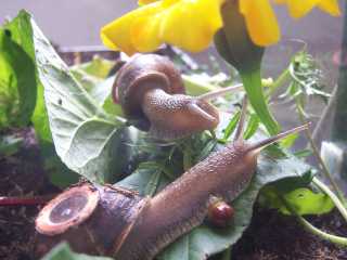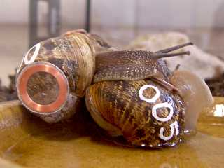 An email travelling from London to New York whizzes down fibre optic cables under the Atlantic ocean at a blistering four hundred and thirty six million miles per hour; just thirty five percent slower than the speed of light. Our snails travel at, well... a snail's pace - 0.0023 miles per hour. If they were to attempt the same journey, across a land bridge, it would take them 171 years 40 weeks and 2 days. Of course we're not going to ask them to do the whole journey, that would be silly and anyway they only live for three years. No, all we ask of our snails is to carry each email 50cm across their enclosure. This should take just over 8 minutes but as you can see in the image of Agatha and Reginald racing towards this freshly placed marigold, they have other things on their mind. |